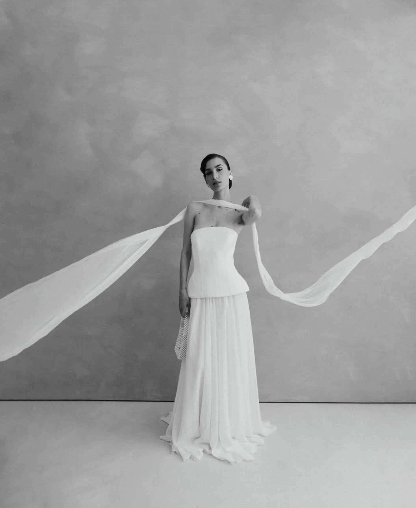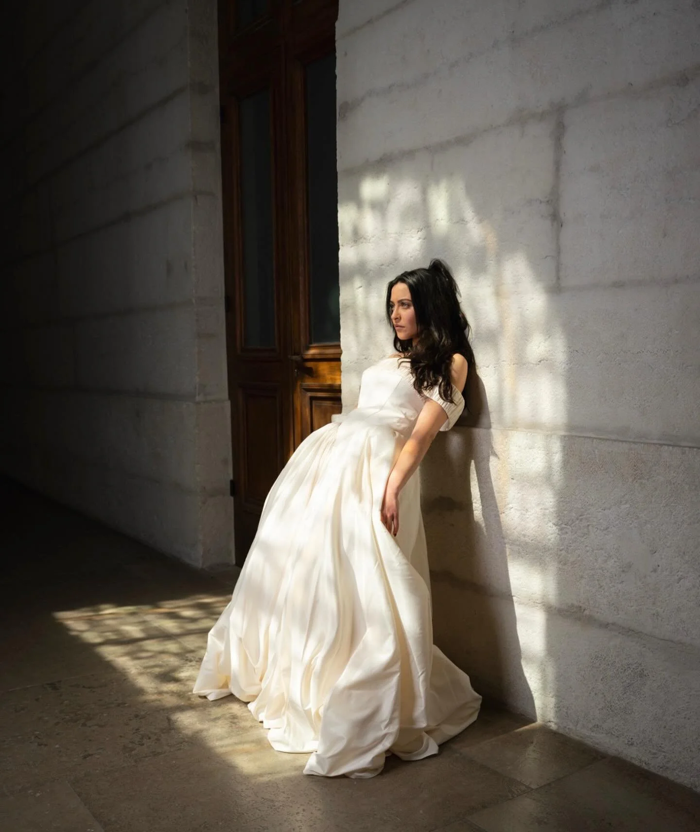 Robe de mariée sculpturale. Bustier tendu sans dureté, jupe ample et grave.